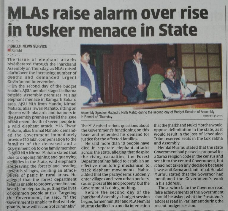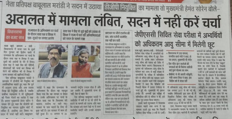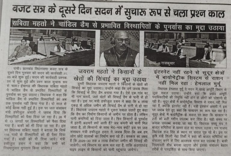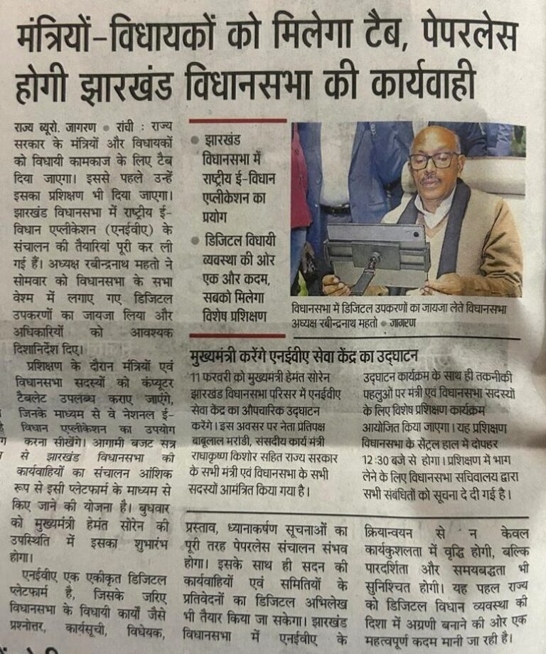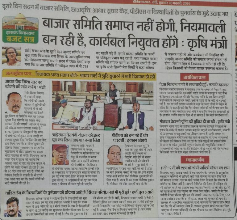 आज दिनांक- 17.02.2026 को 01:00 बजे अप0 में षष्ठम झारखण्ड विधान सभा के पंचम (बजट) सत्र के व्यवस्थापूर्वक संचालन के निमित्त झारखण्ड विधान सभा के विधायक दल के नेताओं / प्रतिनिधियों के साथ श्री रबीन्द्र नाथ महतो, माननीय अध्यक्ष, झारखण्ड विधान सभा ने अपने कार्यालय कक्ष में बैठक की। बैठक में बजट सत्र के औपबंधिक कार्य दिवसों के संबंध में चर्चाएँ हुई। माननीय अध्यक्ष महोदय ने दलीय नेताओं / प्रतिनिधियों से आगामी सत्र के निमित्त सुझाव मांगे एवं विभिन्न सुझावों पर बैठक में विचार-विमर्श हुए। दिनांक – 23.02.2026 को राज्य में नगर निकाय चुनाव के मतदान घोषित होने के कारण बैठक में उक्त तिथि के विधायी कार्यों को परिवर्तित करने पर सहमती बनी, जिसकी अंतिम रूप से घोषणा सत्र के दौरान कार्यमंत्रणा समिति की बैठक में ली जायेगी ।